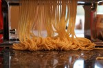 Then, using a rolling pin, roll out the dough and cut it small enough to fit into the pasta machine. I am sure the size cut varies depending on the machine, but our dough pieces were about 3 1/2 to 4 inches wide. My machine had three different slots to crank the dough through. The first was the lasagne which we used first to flatten it out. Then, we ran it through the lasagne slot again to make sure it was even and thin enough. Finally, you run the dough through the spaghetti slot and you get a wonderful pile of spaghetti.