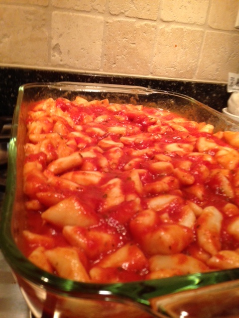 9. Once pieces are cut, place them into the remaining pot of water. Stir constantly. They don’t take long to cook and once they begin to float, you know they are fully cooked. Drain pasta and place in a large, rectangular dish. Pour Prego on top as well as grated Parmesan cheese. Bake in the oven at 350 degrees until cheese is melted, about 10 minutes.