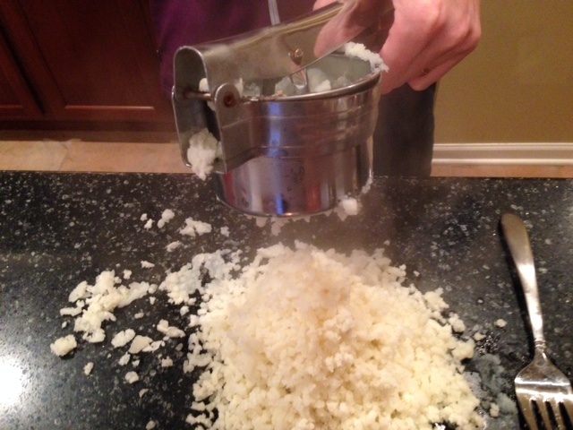 3. Place pot near your work surface, preferably a clean countertop. Place half of a potato into ricer and press down so that potato pieces fall into a mountain-like pile. Continue to press remaining potatoes through ricer.